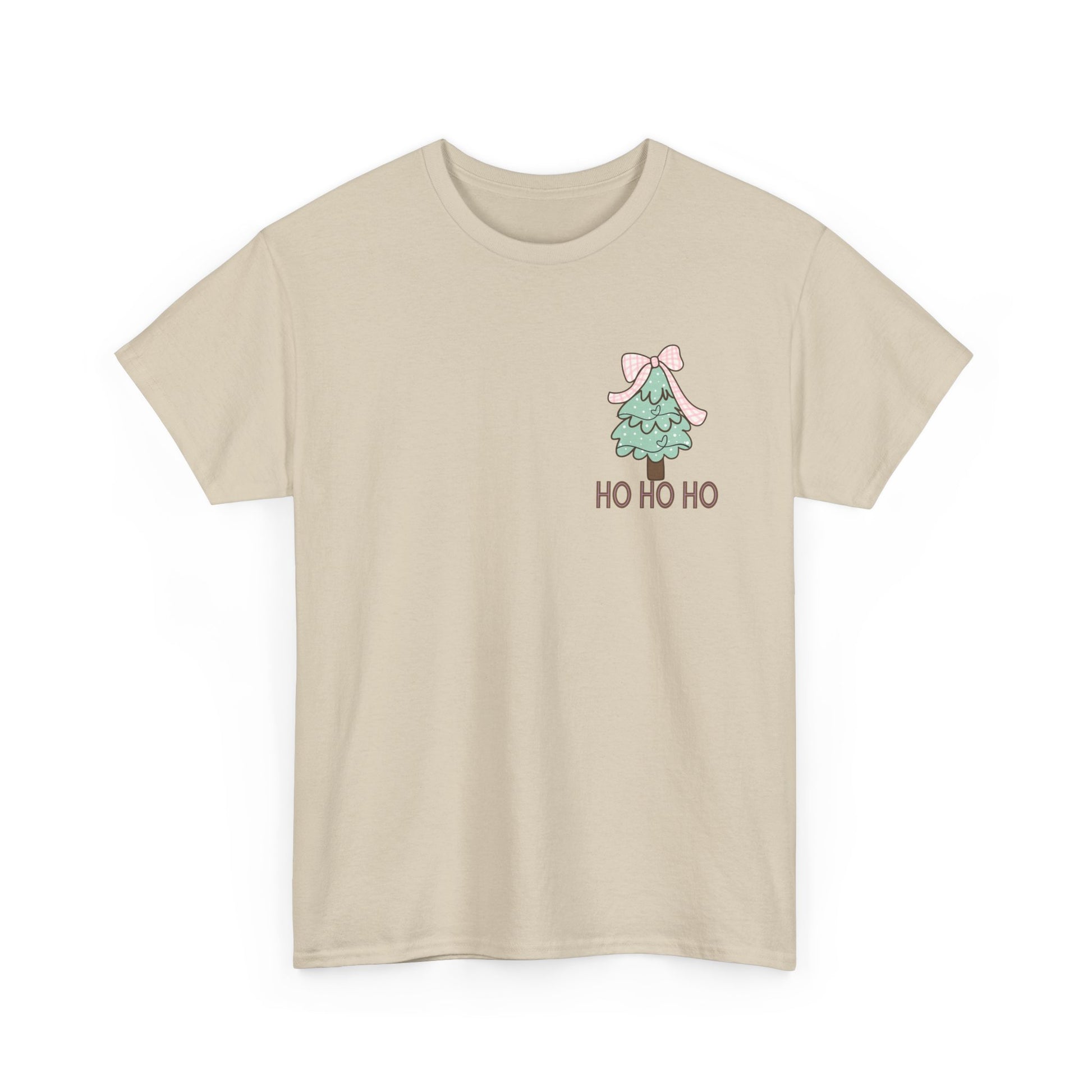 A soft, everyday tee that brings a gentle nod to holiday cheer. The small, hand-drawn Christmas tree with a tied ribbon sits over the heart, whispering playful warmth instead of shouting festivity. Lightweight but durable, the shirt wears in nicely and keeps its shape. It’s for quiet mornings with cinnamon coffee, short walks through neighborhood lights, or wrapping gifts on the living room floor. The neutral, slightly flecked fabric tones the artwork down so the design feels personal — like a sweater passed between friends, only breezier.